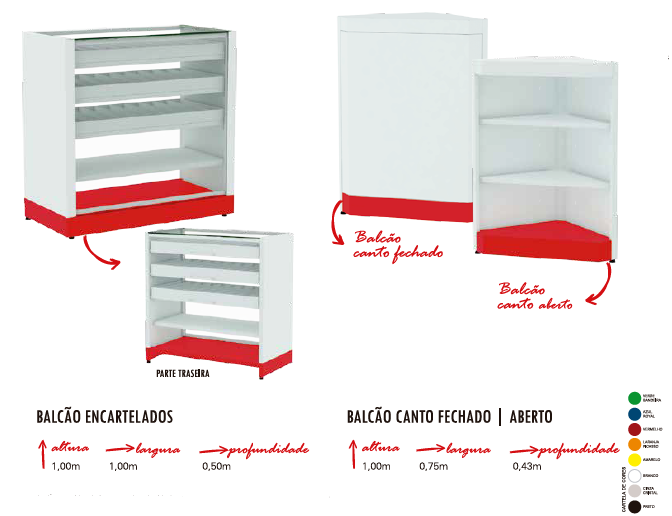 Balcão Encartelados possui 1 bandeja e 3 gavetas para melhor exposição e acomodação das cartelas. Tampo e frente para vidro.