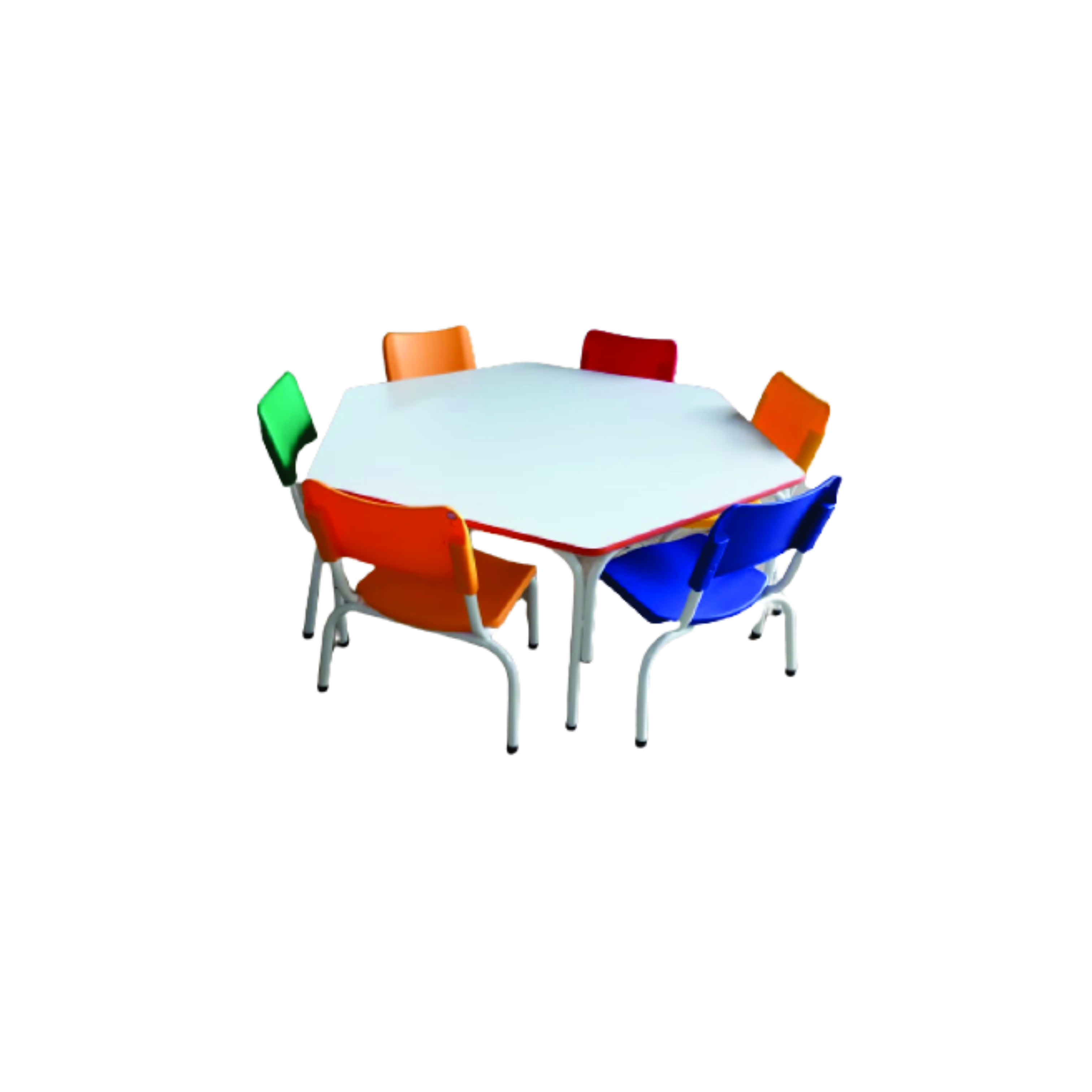 Conjunto Escolar Coletivo Sextavado, com tampo inteiriço em MDF para máxima durabilidade. Seu design espaçoso oferece um ambiente de aprendizado colaborativo, promovendo conforto e funcionalidade